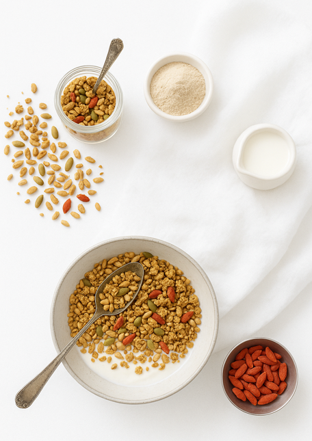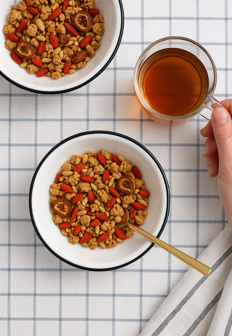 温かいお茶の“ひと呼吸”に加えて、食べるケアを日常化したい——そこで選んだのが、忙しい朝にもおやつにも使いやすいグラノーラ。スプーン一杯から始められて、ヨーグルトや豆乳に合わせるだけで栄養が足せる。無理をしない“続く設計”が軸です。