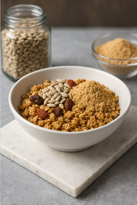 毎日つづく栄養の土台には、たんぱく質が欠かせません。日本の食卓に馴染みがあり、消化にもやさしく、鉄分も含むのが「きな粉」。粉体だから全体に行きわたり、一口ごとに栄養を取りこぼしにくいのも決め手でした。さらに、女性のベースづくりを支えるなつめ、潤いと彩りのクコの実、ビタミンEとミネラルのひまわりの種を組み合わせ、“おいしい=実感”を大切にした設計に。